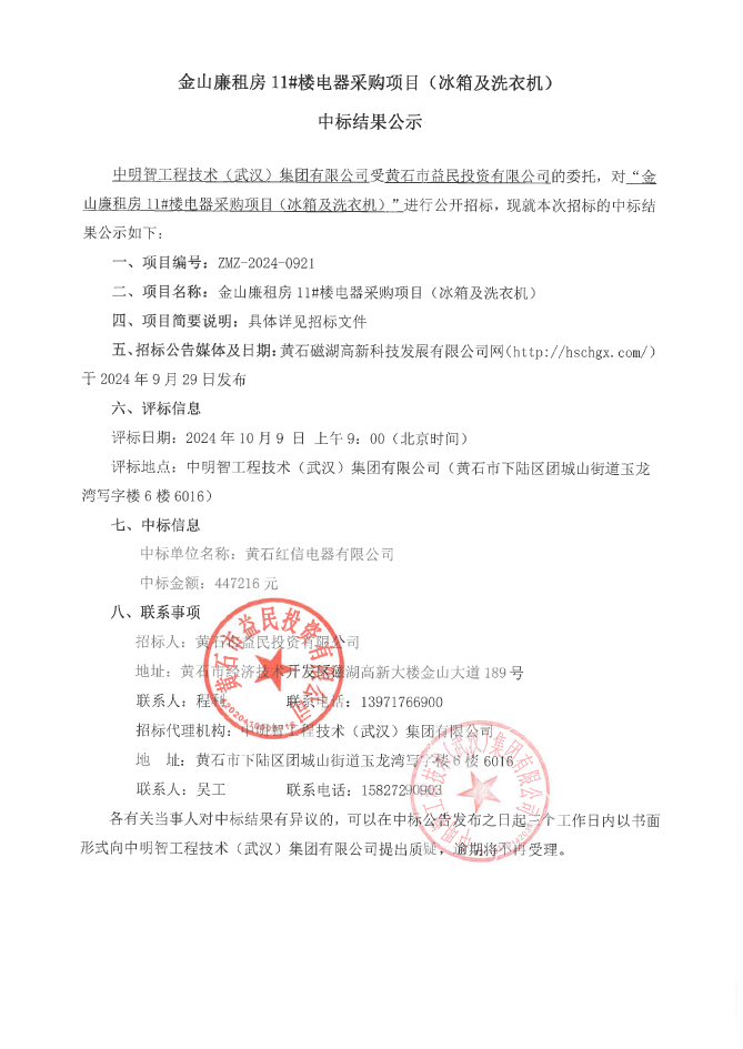 金山廉租房11#樓電器采購項目(冰箱及洗衣機(jī))中標(biāo)結(jié)果公示