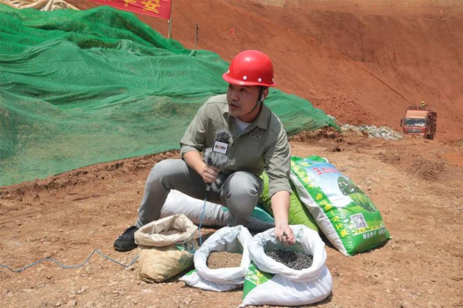 本次報道中,央視記者按照開山塘口修復(fù)的施工時間線,運用了“灰、淡黃、棕褐、綠”這四種顏色,向觀眾形象、通俗地展現(xiàn)了開山塘口修復(fù)治理的全過程?;疑锹懵兜摹ⅰ笆軅钡纳?,淡黃色是干草打碎后形成的草纖維,棕褐色是混入不同種子后的泥漿,綠色則是希望、是健康、是礦山修復(fù)的終極目標(biāo)。
