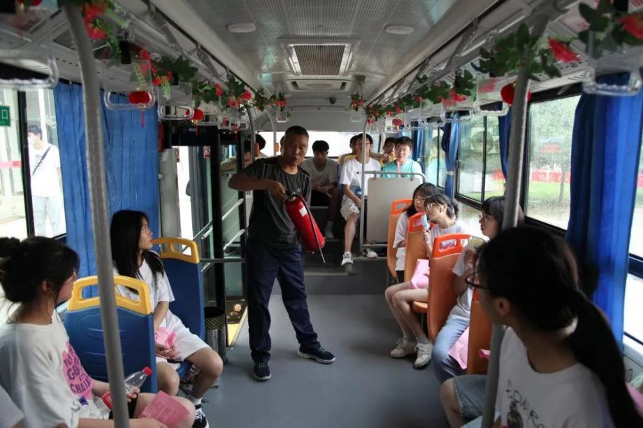 在公交車廂,駕駛員帶領(lǐng)同學(xué)們親身體驗在模擬突發(fā)狀況下,正確使用逃生錘、滅火器,并快速撤離現(xiàn)場等實操內(nèi)容。