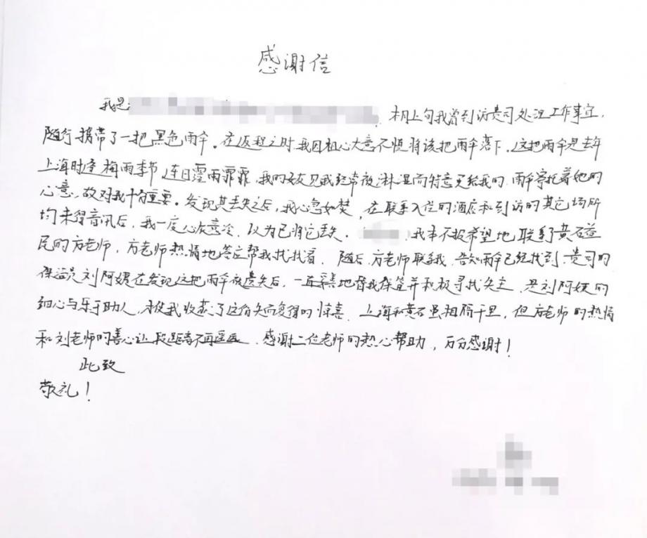 發(fā)現(xiàn)遺失貴重信物的李先生心急如焚,幾經輾轉,多方找尋,卻都是無功而返……抱著最后的希望,李先生聯(lián)系了近期到訪的磁湖高新公司,公司融資專員方旭得知情況后迅速聯(lián)系各方,幫助尋找。令人欣慰的是,物業(yè)保潔員劉愛心撿到了這把傘并妥善保管,也在四處尋找這一貴重物品的失主……“珍寶”失而復得,李先生十分感動,親手寫下了這封感謝信,并專程從上海寄來,以表感激之情。