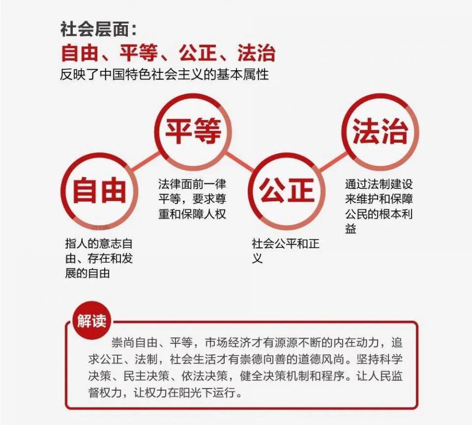 自由、平等、公正、法治體現(xiàn)了社會主義核心價值觀在價值導(dǎo)向上的規(guī)定,是立足社會層面提出的要求,反映了社會主義社會的基本屬性,始終是我們黨和國家奉行的核心價值理念。