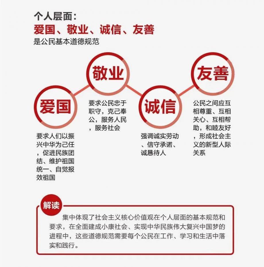 愛國、敬業(yè)、誠信、友善體現(xiàn)了社會主義核心價值觀在道德準(zhǔn)則上的規(guī)定,是立足公民個人層面提出的要求,體現(xiàn)了社會主義價值追求和公民道德行為的本質(zhì)屬性。