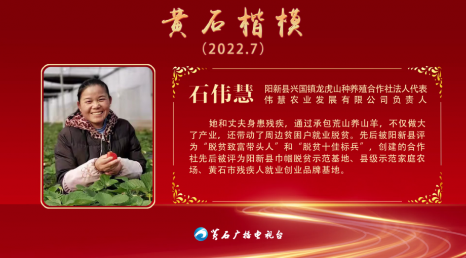 先后被陽新縣評(píng)為“脫貧致富帶頭人”和“脫貧十佳標(biāo)兵”,創(chuàng)建的合作社先后被評(píng)為陽新縣巾幗脫貧示范基地、縣級(jí)示范家庭農(nóng)場(chǎng)、黃石市殘疾人就業(yè)創(chuàng)業(yè)品牌基地。