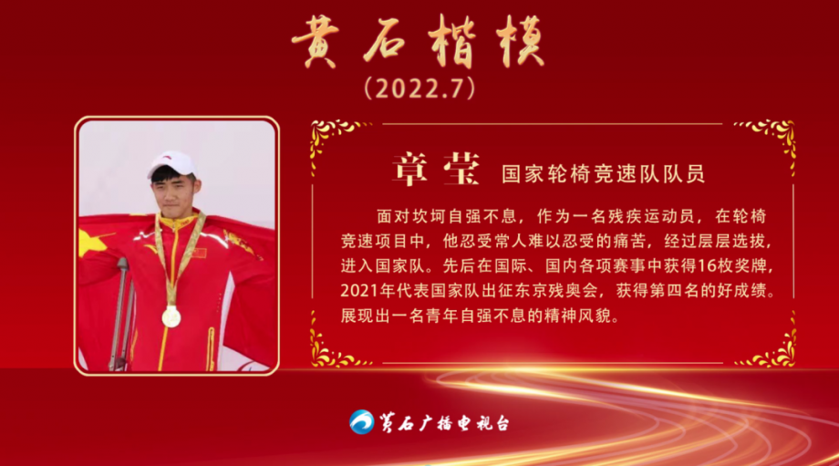 章瑩,男,23歲,大冶籍國家輪椅競(jìng)速隊(duì)隊(duì)員。