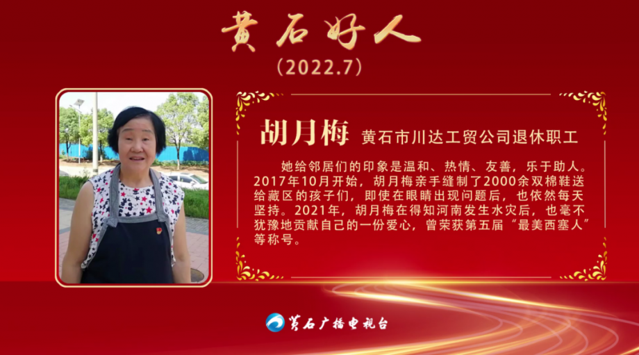 2017年10月開始,胡月梅親手縫制了2000余雙棉鞋送給藏區(qū)的孩子們,即使在眼睛出現(xiàn)問題后,也依然每天堅(jiān)持。2021年,胡月梅在得知河南發(fā)生水災(zāi)后,也毫不猶豫地貢獻(xiàn)自己的一份愛心,曾榮獲第五屆“最美西塞人”等稱號(hào)。