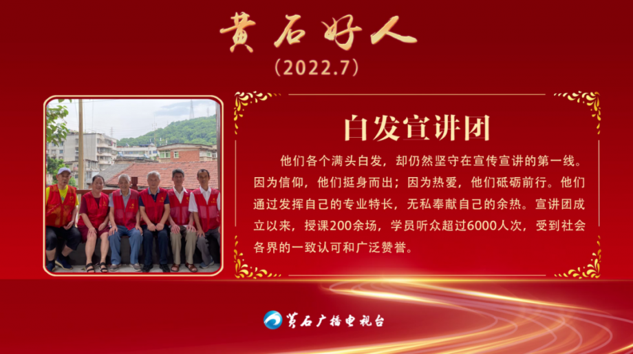 白發(fā)宣講團(tuán),西塞山區(qū)白發(fā)宣講團(tuán)成立于2015年,由西塞山區(qū)東屏社區(qū)居民王定球、高維章、吳國華三位退休黨員發(fā)起組建,現(xiàn)有骨干成員6人,宣講隊(duì)伍30余人。